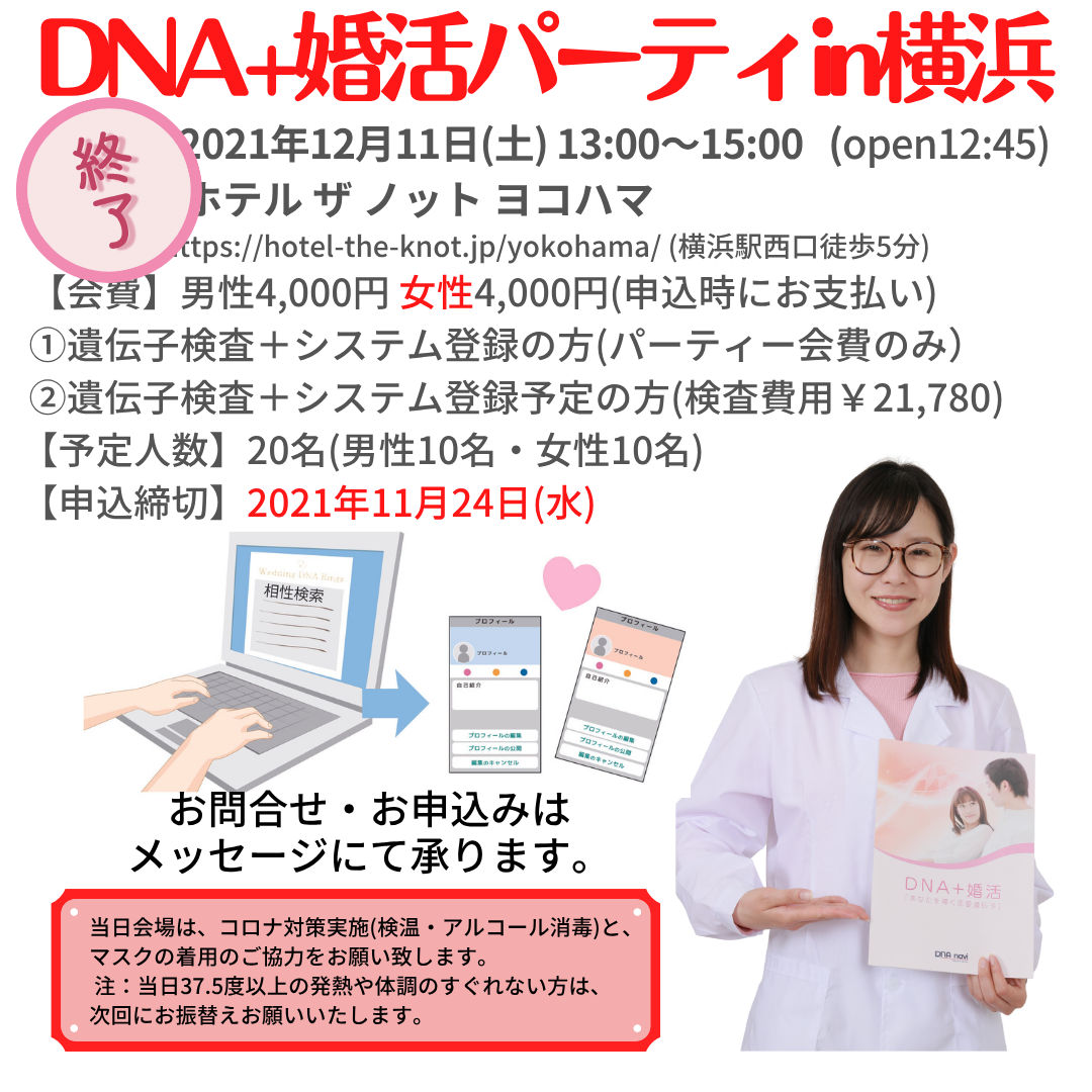 DNAnavi婚活って何?? 詳細はHPを参照して みてくださいね。 https://bridalyokohama310.com/dnanavi/ 簡単に言うと 遺伝子マッチングで素敵な 出会いを見つけませんか。 科学的な相性でのマッチングです。 女の子が年頃になると 「お父さんの匂いが受け付けない」 ってよく言われませんか。 父親からは50%遺伝子を 受け継いでいるので、 (お母さんからも50%) 遺伝子が近すぎるのです。 ですので、お父さんの遺伝子が 確実に受け継いでいるんです。 HLA遺伝子には数万通りの型が あるのですが、その型番が離れて いるほど相性が良いと言われてます。 DNA+婚活パーティは男女4,000円 さらにシステムに登録して お相手を探す場合、検査費用が 原価(21,780円)で受付けています。 この機会にぜひ参加されて みてくださいね。